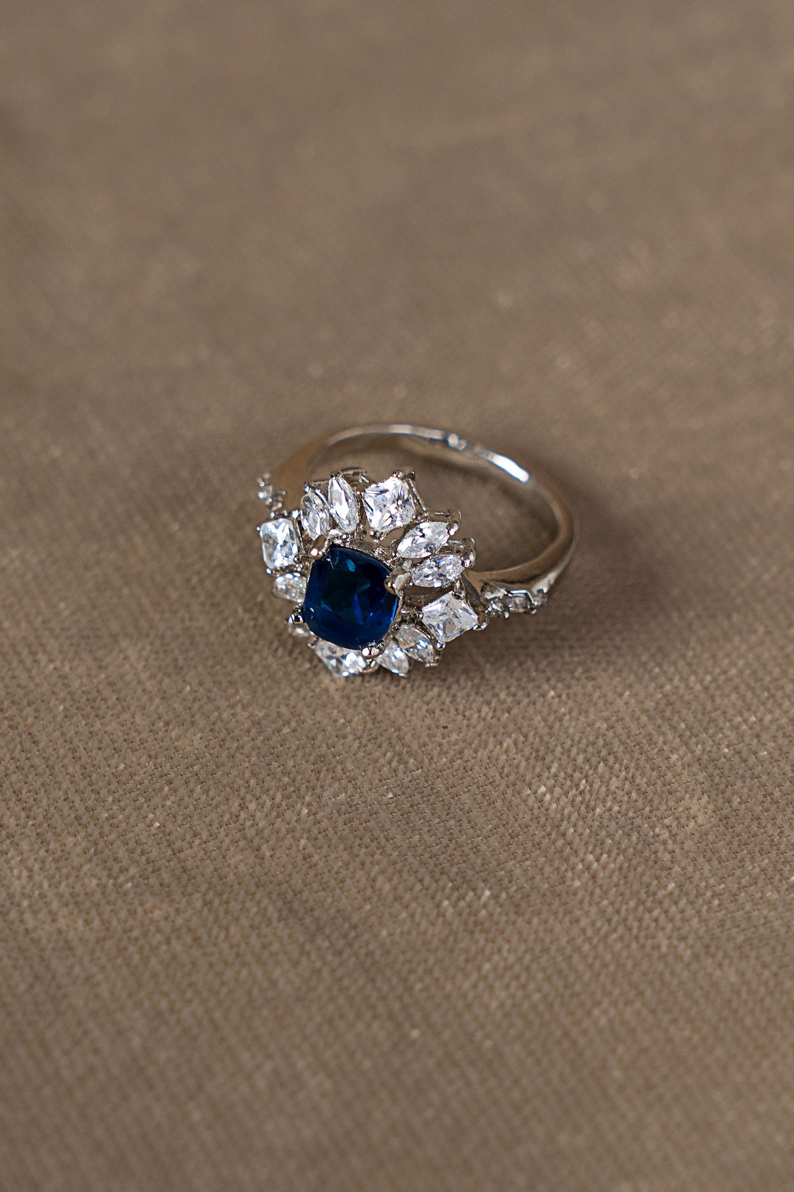 Where modern elegance meets timeless allure - this ring features a glistening sapphire blue stone at its heart, embraced by sparkling white zircons artistry Bold yet graceful, it’s an artistic statement of sophistication, designed to captivate and elevate every glance.