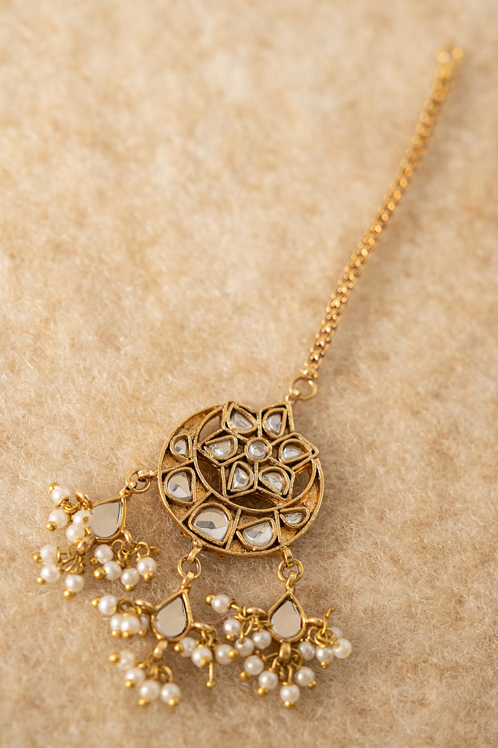 Twinkle like the stars with this adorable tikka, where sparkling white handcut glass meets soft, dreamy pearl pyroi. A magical blend of tradition and charm, made just for your little princess to shine bright on every festive day.